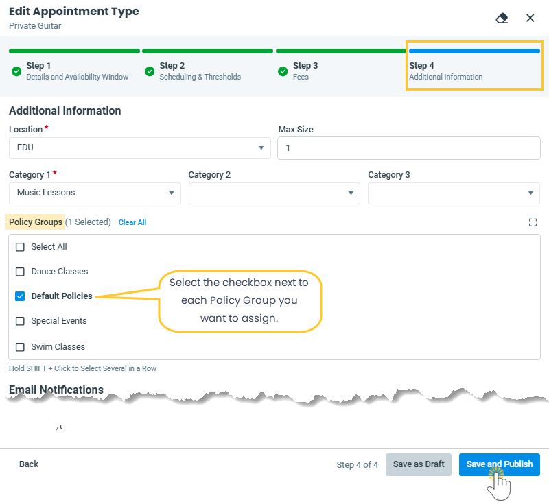 Depending on your organization and the Appointments you offer, you may need to assign specific Policy Groups for private lessons, evaluations, room rentals, and more. This determines which policies families must agree to when booking an appointment.