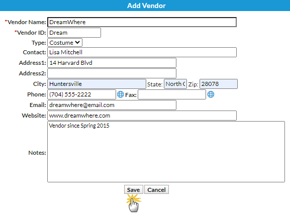 - Enter the vendor details In the Add Vendor window. To modify the drop-down selections for Type, go to Gear (icon) > Settings > General > Drop-down Lists (left menu) > Vendor Types (Costume/Apparel).