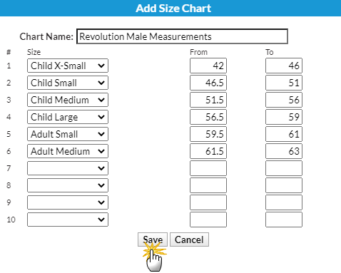 - Using the vendor's size chart, enter sizes & girth measurements. Size names (Example: Child X-Small) are created in Gear (icon) > Settings > General > Drop-down Lists (left menu) > Student > Sizes. See Add Student Sizes.
