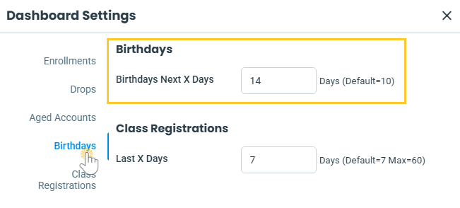 A. Yes! You can customize the Birthdays Next X Days field in your Dashboard Settings. At the top right of the Executive Dashboard, click Dashboard Settings and select Birthdays on the left menu to scroll to that section. Enter the number of days you want to watch for upcoming birthdays.
