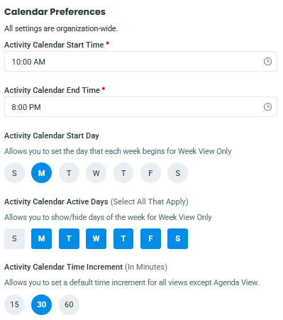 All Calendar Settings are organization-wide and apply to all Users. Follow these steps to tailor your calendar display and improve scheduling efficiency.